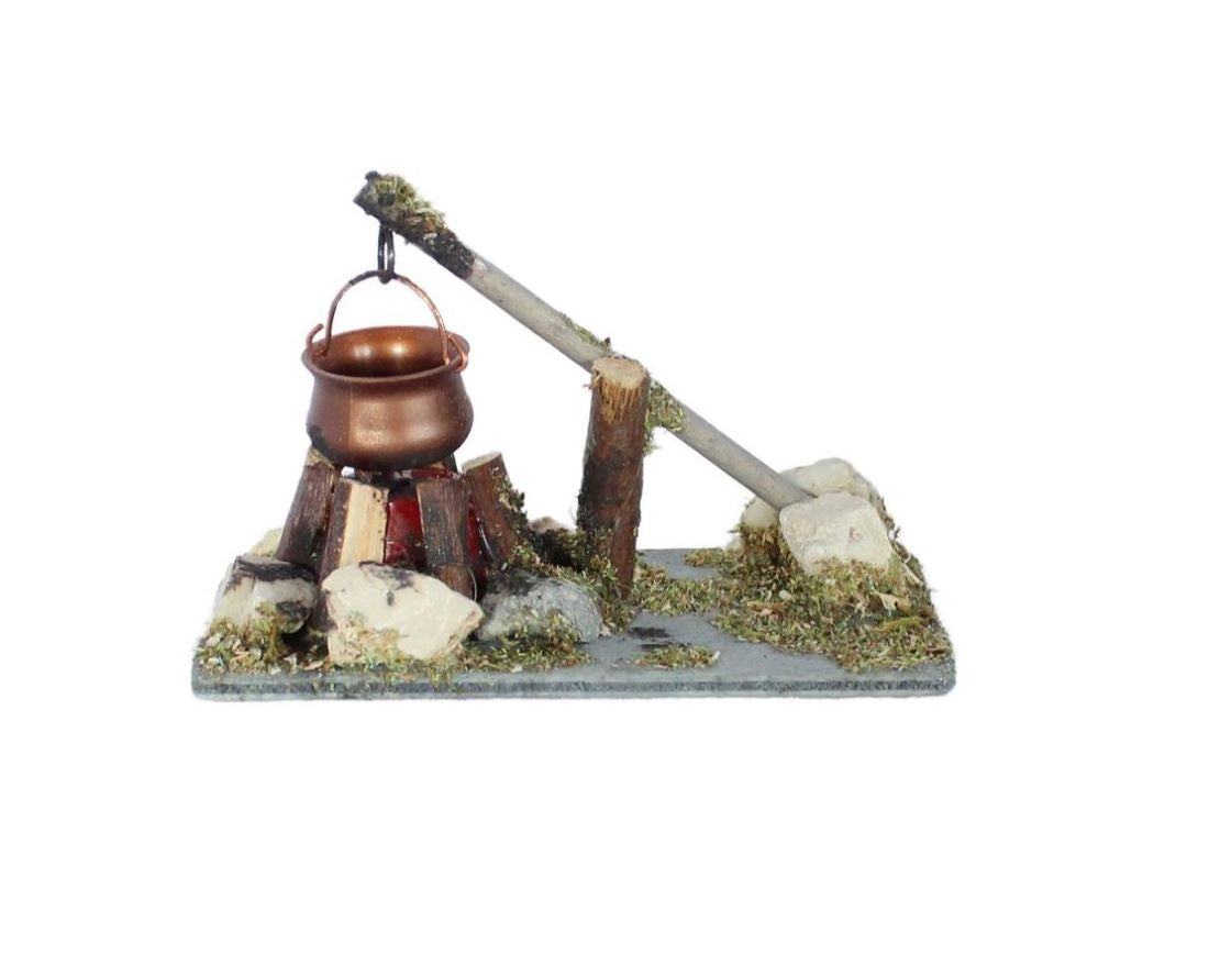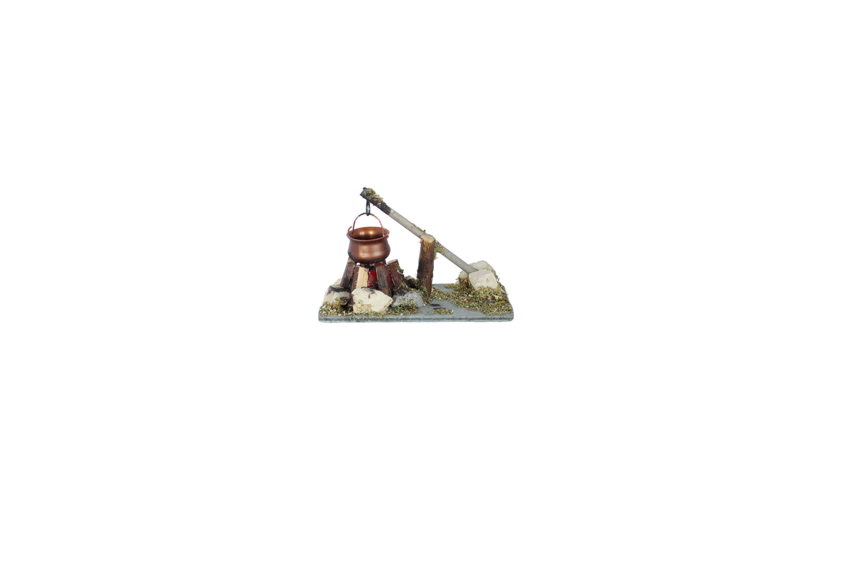 FADEDA Hirtenlagerfeuer mit Kessel , LxBxH in mm: 85x50x60. Für Krippen, Miniatur-, Hobby- und Modellbau, Puppenhauszubehör u. Modelleisenbahn.