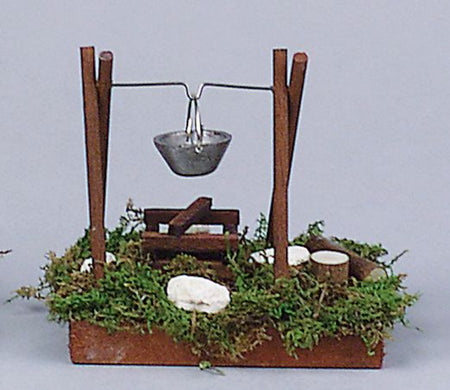 FADEDA Lagerfeuer mit Kessel und Holzaufbau, LxBxH in mm: 65x50x75. Für Krippen, Miniatur-, Hobby- und Modellbau, Puppenhauszubehör u. Modelleisenbahn.